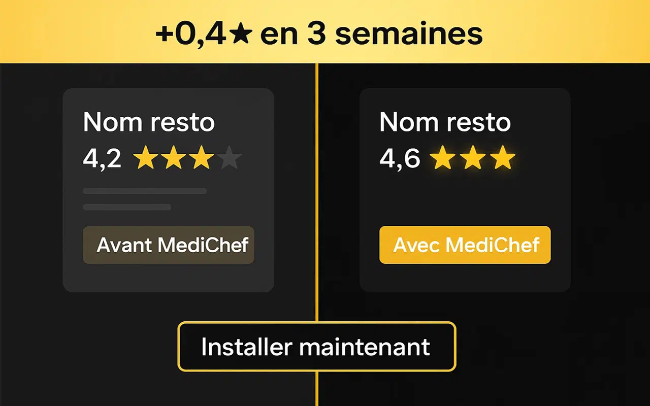 MediChef concentre l’effort sur les clients ravis : en moyenne +0,4★ après trois mois. Les mécontents passent par un formulaire privé, vous donnant une chance de résoudre le problème hors ligne.