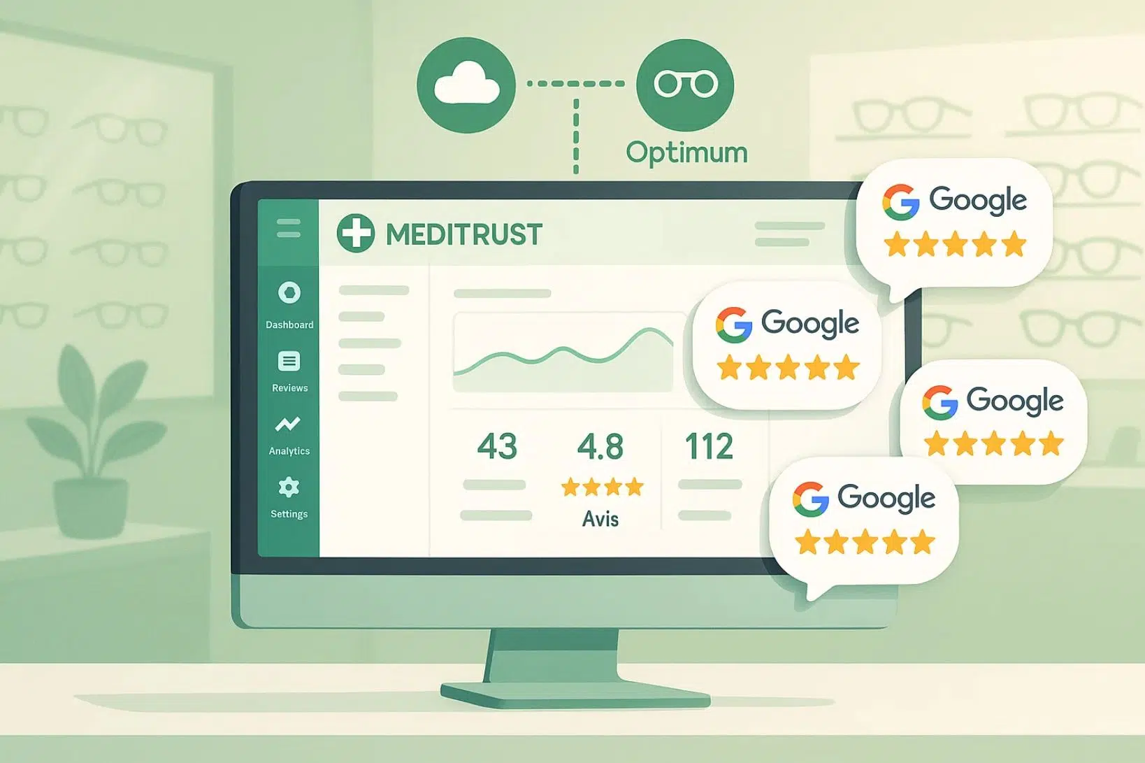 Connectez Meditrust à votre logiciel Optimum. Après chaque vente, un questionnaire est envoyé : seuls les clients satisfaits sont invités à laisser un avis Google. 100 % automatisé, 0 stress.