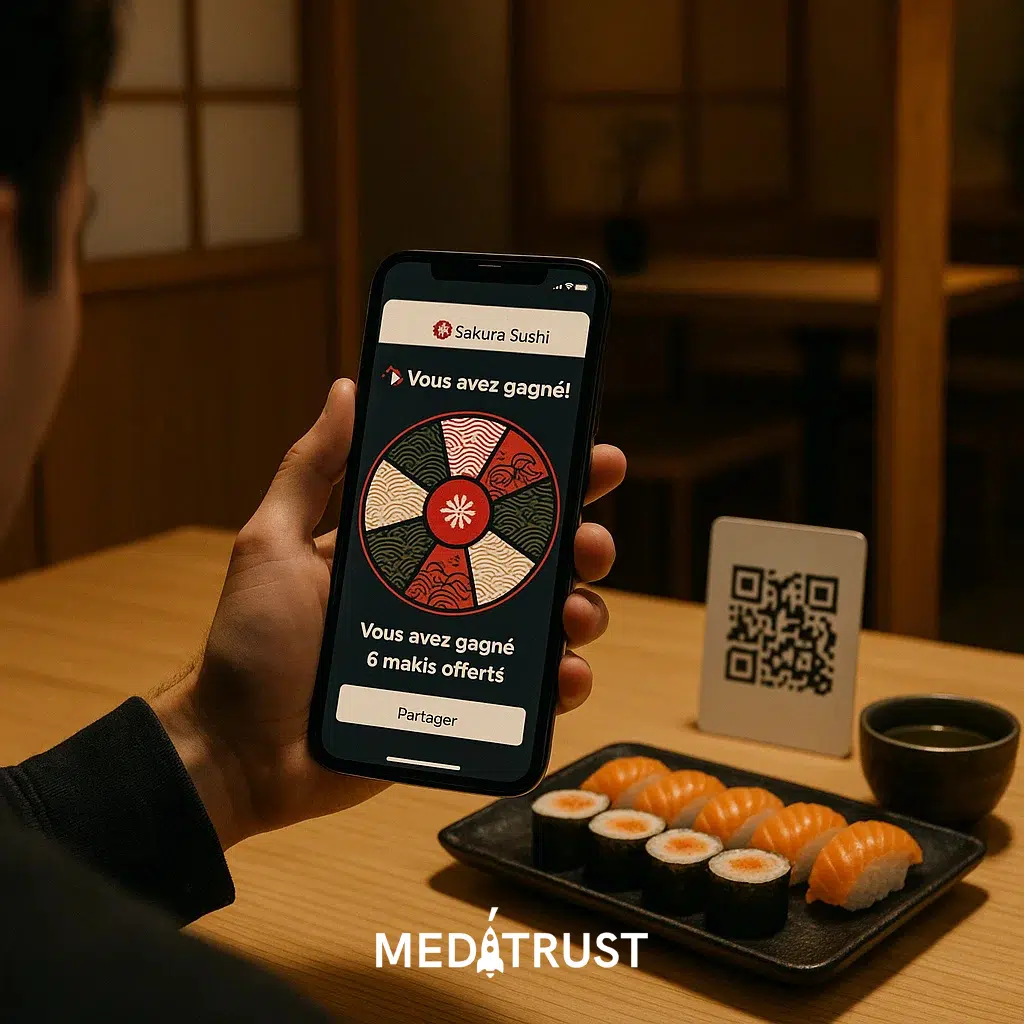 Une fois le lot gagné, le client peut partager en un clic sur Instagram, WhatsApp ou TikTok. Résultat : visibilité immédiate.